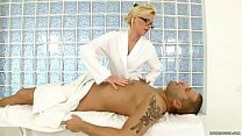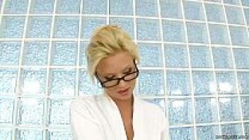 Amber Jayne, a busty blonde nurse, has the doctor's large dick within her pussy.
