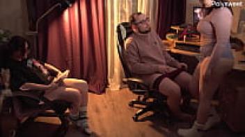 The glasses-wearing girl enjoys watching her buddies have sex.
