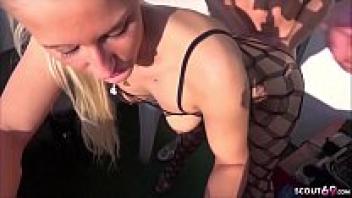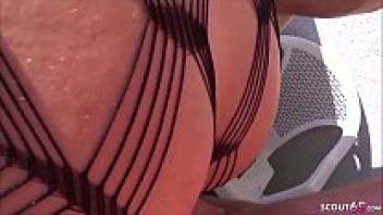 Anna B, a slim German teen, is in love in an MMF threesome in public on a balcony.