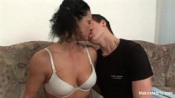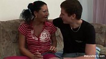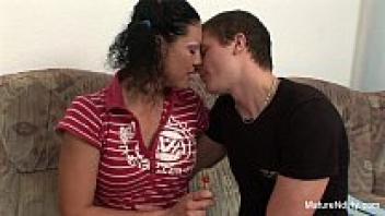A young guy is adored by a horny granny.