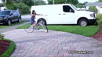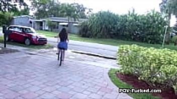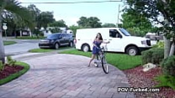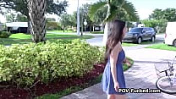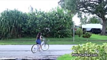 Tanned brunette teen gets loved outside.