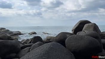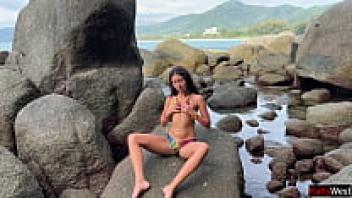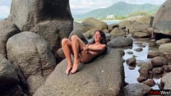On a public beach, a nude brunette engages in oily masturbation.