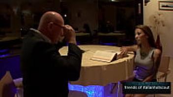 An elderly man adores a stunning brunette female.