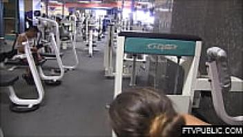 exposing one's tits in public. A sporty girl displays her nipples in the gym.