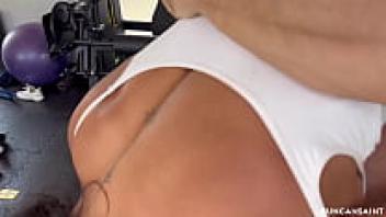 Beautiful babe squirts all over the gym and splits on his cock.