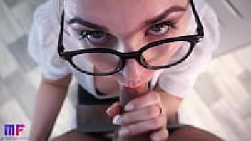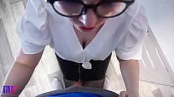 In the office, a secretary with large tits and spectacles entices her boss to have sex.