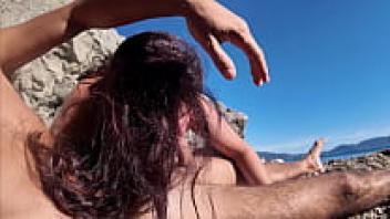 On the beach, a busty MILF with natural tits adores
