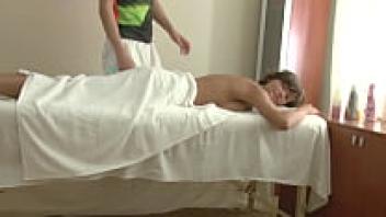Big tits are pushed all over clients in massage rooms by an oiled teen.