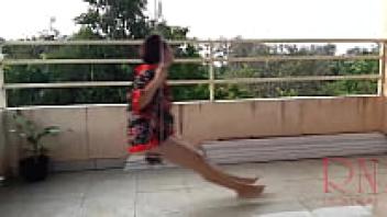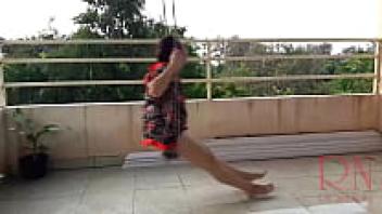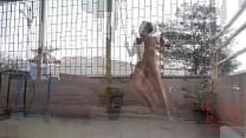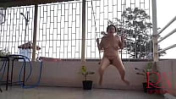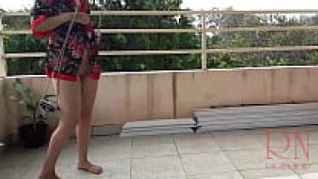 An umbrella protects the depraved housewife from the rain as she swings sans underwear. The entire video